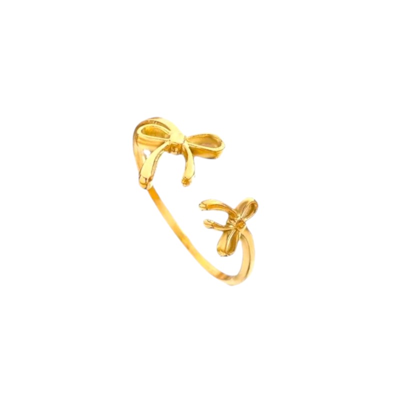 Scopri l'eleganza minimalista di questo anello in acciaio inossidabile placcato oro, perfetto per chi ama i dettagli raffinati. Il design aperto con due delicati fiocchi crea un look sofisticato e versatile, ideale da indossare da solo o abbinato ad altri anelli. La placcatura in oro garantisce una finitura luminosa e duratura, mentre l'acciaio inossidabile assicura resistenza nel tempo. Un accessorio essenziale che aggiunge un tocco di grazia al tuo stile quotidiano, senza compromessi sulla qualità.