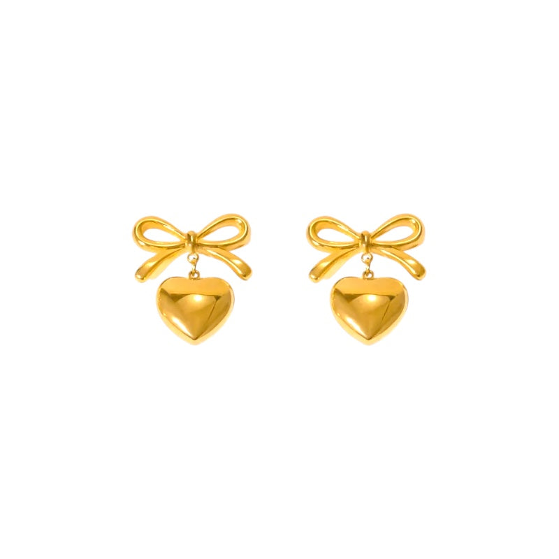 Orecchini delicati e raffinati che catturano l'essenza della femminilità. Realizzati in acciaio inossidabile placcato oro, questi orecchini a forma di cuore con fiocco combinano eleganza senza tempo e durabilità. Il rivestimento in oro garantisce una finitura luminosa che resiste nel tempo, mentre il design romantico li rende perfetti per occasioni speciali o per aggiungere un tocco di charme al tuo look quotidiano. Ipoallergenici e resistenti all'ossidazione, sono la scelta ideale per chi ama gioielli sofisticati che durino nel tempo.