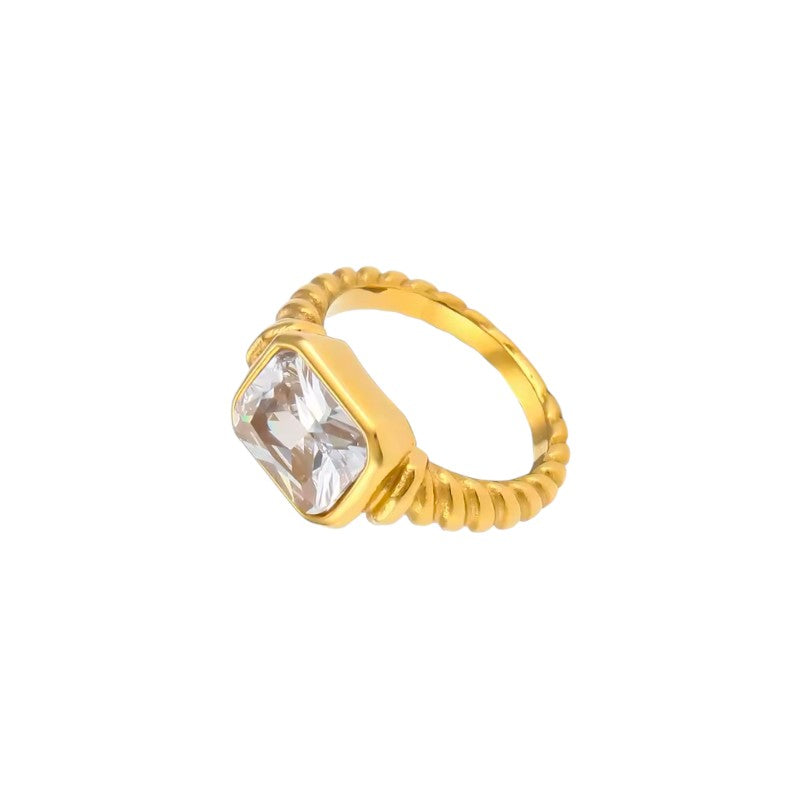Anello chunky in acciaio inossidabile placcato oro che cattura lo sguardo con uno splendido zircone al centro. Il design massiccio e audace lo rende il pezzo perfetto per chi ama gioielli che fanno dichiarazioni forti. La chiusura sicura garantisce comfort durante tutto il giorno, mentre la placcatura in oro aggiunge un tocco di lusso accessibile. Ideale per completare qualsiasi look con eleganza contemporanea e personalità.