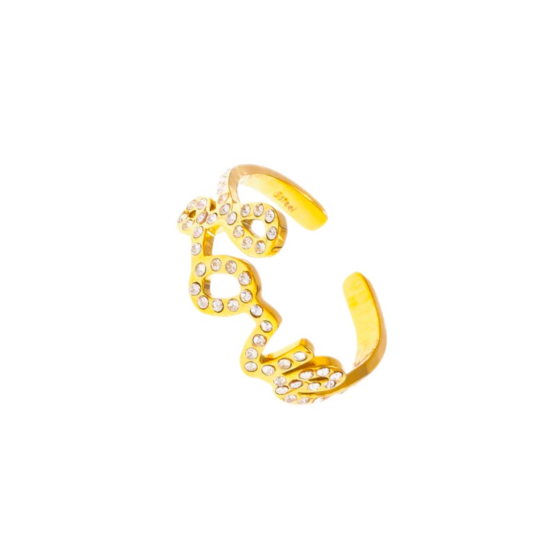 Anello aperto placcato in oro che cattura l'essenza dell'amore in ogni dettaglio. La scritta "Love" è impreziosita da brillanti zirconi che riflettono la luce, creando un effetto scintillante e sofisticato. Il design aperto lo rende versatile e confortevole da indossare, adattandosi perfettamente a qualsiasi polso. Ideale per chi desidera un accessorio che esprima sentimenti profondi con eleganza. Un pezzo che combina stile contemporaneo e significato emotivo, perfetto come regalo speciale o per arricchire la tua collezione personale.