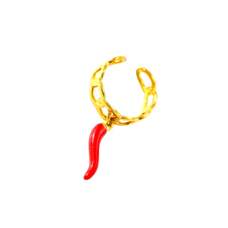 Anello regolabile in acciaio inossidabile placcato oro che unisce eleganza e originalità. Il peperoncino pendente aggiunge un tocco di carattere e personalità al tuo stile quotidiano. Resistente e ipoallergenico, si adatta perfettamente a qualsiasi dito grazie alla regolazione. Un accessorio versatile che cattura lo sguardo e racconta la tua unicità, ideale per chi ama dettagli audaci e significativi.