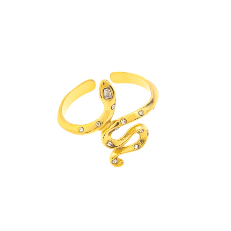 Scopri l'eleganza selvaggia con questo anello aperto placcato in oro, sapientemente modellato a forma di serpente sinuoso. I brillanti zirconi catturano la luce con ogni movimento, creando un effetto scintillante che attira lo sguardo. Perfetto per chi desidera un accessorio audace e sofisticato, questo anello si adatta a qualsiasi polso grazie alla sua forma aperta e flessibile. Un pezzo statement che trasforma il tuo look quotidiano in qualcosa di straordinario e affascinante.
