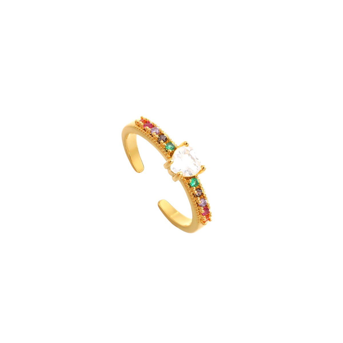 Unisci eleganza e colore con l'anello solitario I'M MARTINA, realizzato in acciaio inossidabile placcato in oro. Il cuore centrale in zircone cattura lo sguardo, mentre i delicati zirconi multicolor ai lati aggiungono un tocco vivace e unico. Anallergico e resistente all'acqua, questo gioiello mantiene brillantezza e bellezza nel tempo, perfetto per accompagnarti sempre con stile e comfort.