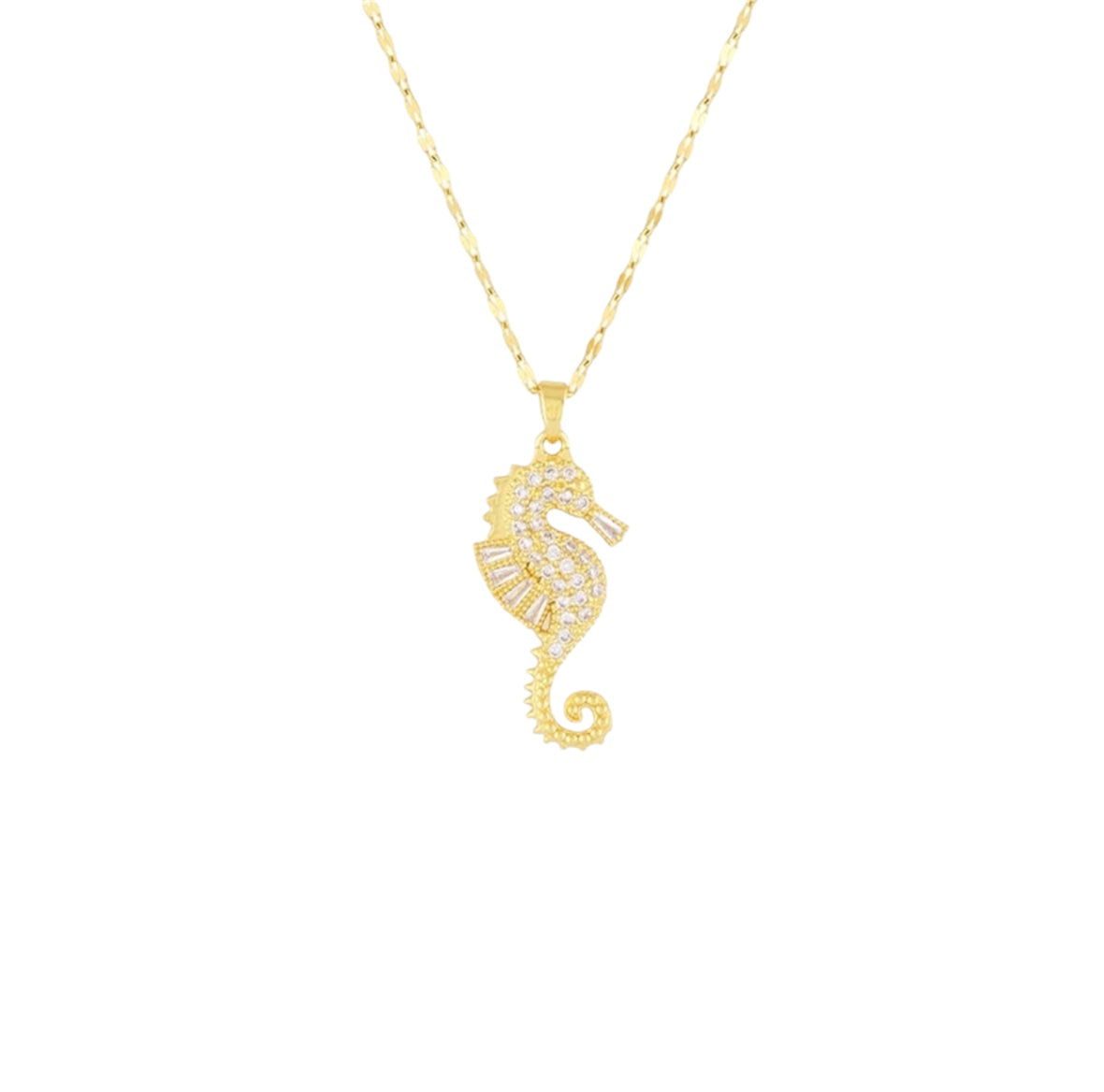 Collana elegante in acciaio inossidabile placcato oro, impreziosita da zirconi che catturano la luce con brillantezza. Il delicato cavalluccio marino diventa un simbolo di grazia e unicità al collo. Realizzata con acciaio anallergico di qualità, resiste all'ossidazione e al contatto con l'acqua, mantenendo intatta la sua bellezza nel tempo. Un accessorio versatile che accompagna ogni momento della tua giornata senza compromessi sulla qualità.
