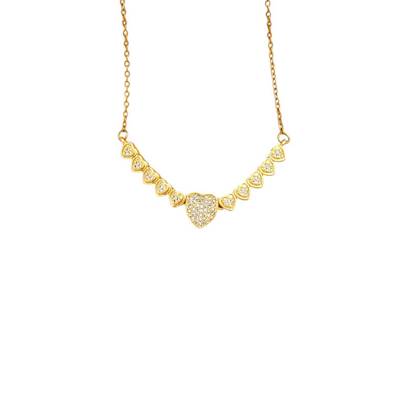 Collana in acciaio inossidabile placcata in oro che cattura lo sguardo con eleganti cuori zirconati. Ogni dettaglio brilla di luce propria, creando un effetto luminoso che valorizza il tuo stile. La placcatura in oro garantisce una finitura sofisticata e duratura, mentre l'acciaio inossidabile assicura resistenza nel tempo. Perfetta per chi desidera un accessorio che unisce bellezza e qualità, ideale da indossare ogni giorno o per occasioni speciali.